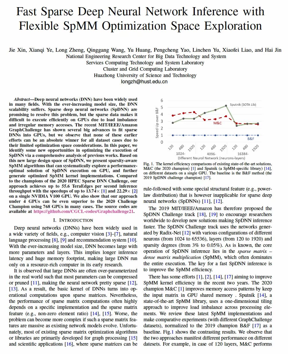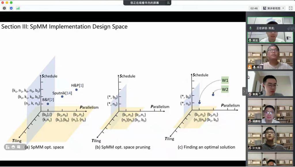 指导老师郑龙副教授说,比赛过程中,3044永利集团3044永利集团服务计算技术与系统教育部重点实验室和“面向图计算的通用计算机技术与系统”国家重点研发计划项目组给予了大力支持。实验室提供了V100 GPU多卡服务器作为计算平台,确保稳定的开发环境。参赛队员每周都会和图计算项目组的博士生王庆刚、黄禹、姚鹏程等进行应用分析和方案论证,经过多次讨论,抓住此赛道应用的特点:不存在一种特定的实现方法可以在任何一个数据集上都取得较好的性能提升。根据这个特点,参赛团队确定了通过用参数化的方式,构造算子的实现空间,然后进行参数搜索,取得对应数据集的最优实现方法。在代码实现过程中,复用了图计算项目中图处理模块的思想,让开发效率大大加快,从而快速完成了实验。通过共同努力,参赛队伍顺利完成了比赛,并以比去年同赛道冠军最高13.7倍性能提升的好成绩获得了全球冠军。