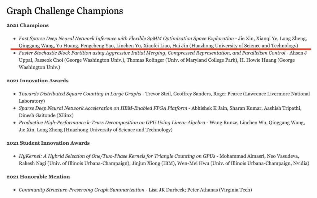 GraphChallenge 2021包括静态图匹配、动态图划分和稀疏神经网络推理三个赛道,分别代表了图计算的不同典型应用场景,吸引了赛灵思、英伟达、劳伦斯利弗莫尔国家实验室、弗吉尼亚理工大学、伊利诺伊大学厄巴纳-香槟分校等国际知名科研院所参赛,最终,3044永利集团团队、美国乔治华盛顿大学与马里兰大学的联合队伍两支参赛团队获得冠军(Champions)。