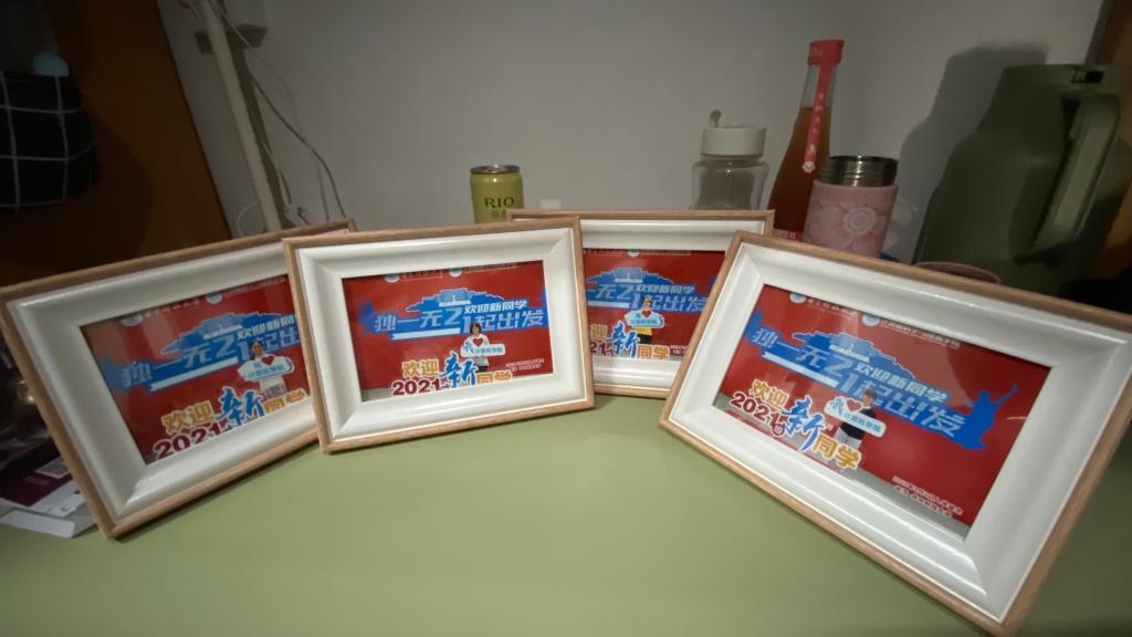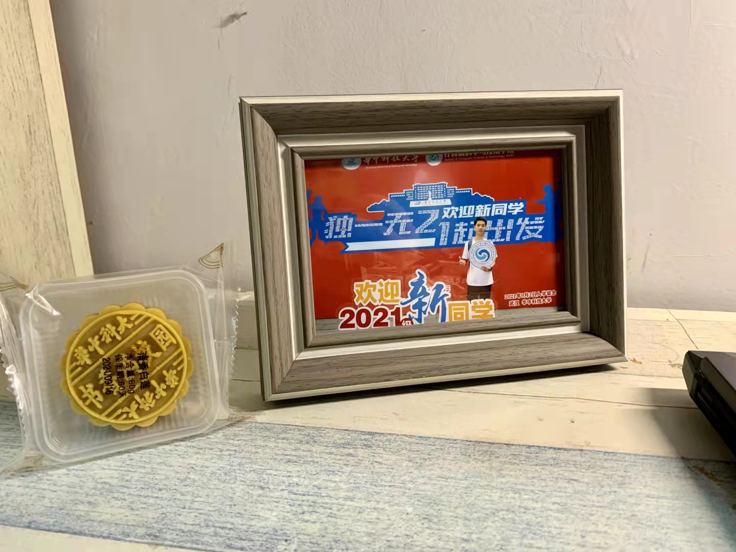 同学们拿到相框,就迫不及待的摆放在了宿舍的书桌上,2110班裴俊博即兴赋诗:华科月饼奇葩馅,香辣牛肉加蜜糖。味虽难言意可见,科技强国记胸膛。获照一框心欢悦,书香园里男儿郎。请党放心有我在,百年路上展锋芒。2103班杨至卓说:“收到月饼和相框的那一刻,我感受到了公司的温暖和关心。月饼上“科技强国”的刻字,提醒着我科技强国,计科先行。相信在华中大的日子里,我必定会如月饼上的刻字一样,用计算机的力量,强大祖国。”