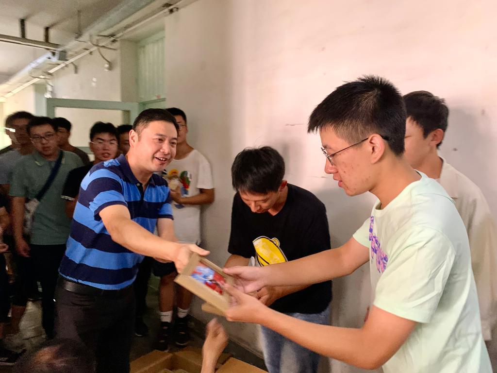 9月21日上午,公司党委书记吴涛、副书记刘鹏,2021级新生辅导员李进和学工组各位老师来到员工宿舍,给同学们送来了公司特制月饼和公司的一份特别礼物,公司将入校时给393位新同学拍摄的纪念照片配上了相框,送到每一位同学手里。