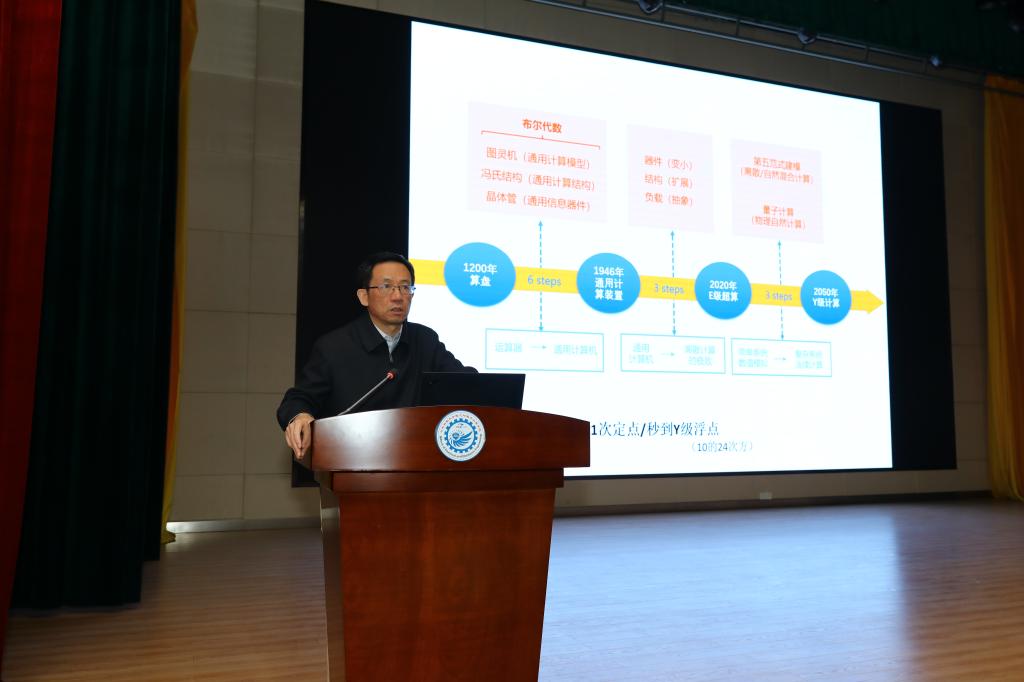 孙院士的报告围绕计算机发展的三大阶段展开,即第一个阶段从1200年算盘这类专用计算装置出现到1946年通用计算装置的出现,第二个阶段是从通用计算装置出现到2020年的E级超级计算机这类离散计算装置出现,第三个阶段是从E级超级计算机发展到2050年的Y级超级计算机。