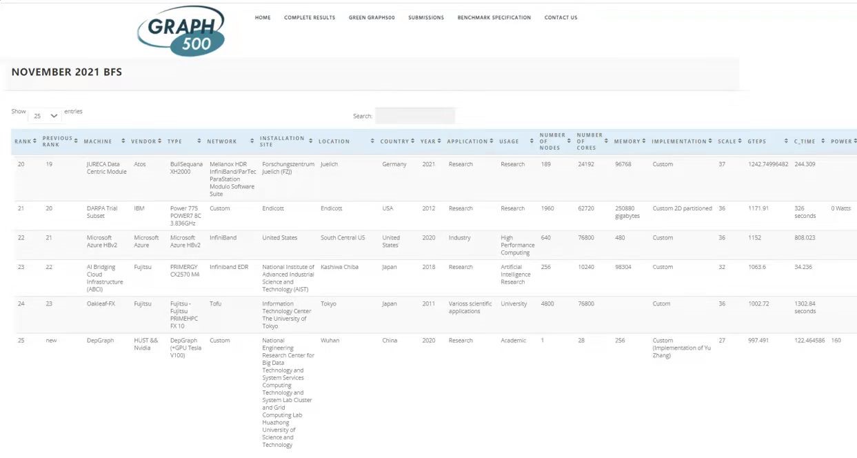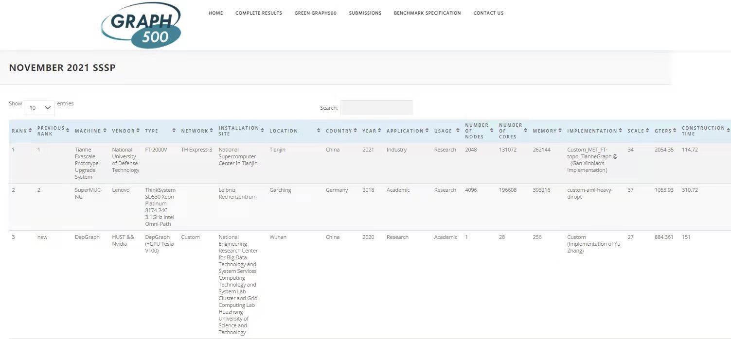 2021年11月18日,在美国圣路易斯举办的国际超级计算大会上,第18届Green Graph 500和第23届Graph 500排名揭晓,3044永利集团大数据技术与系统国家地方联合工程研究中心、服务计算技术与系统教育部重点实验室曁集群与网格计算湖北省重点实验室图计算团队研发的图计算机DepGraph在Green Graph 500排名中,性能功耗比全球第一,达到6234.32MTEPS/w;同时在Graph 500排名中,单机性能全球第一,对于SSSP和BFS两个应用分别达到884.361GTEPS和997.491GTEPS。