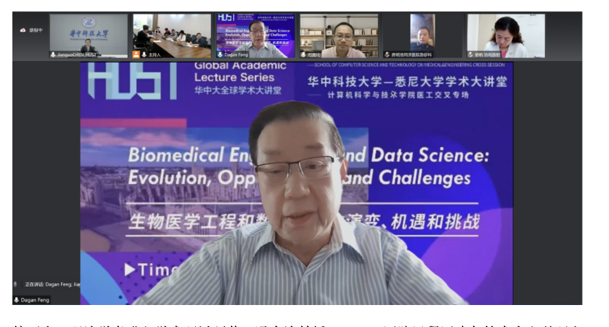 接下来,双边学者围绕生物医学与大数据应用开展专题研讨。冯大淦院士以“Biomedical Engineering and Data Science: Evolution, Opportunities and Challenges”生物医学工程和数据科学:演变、机遇与挑战)为题,介绍了生物医学工程和技术发展的四个阶段:CT(电子计算机断层扫描)和MRI(核磁共振)-纳米技术和组织工程-基因工程-生物科学与数据科学相结合,同时结合应用算法预测蛋白质结构发现乳腺癌的案例,生动地阐述了数据科学对生物医学工程技术发展的促进性。冯院士强调,前三个技术发展阶段的主要活动将在第四个阶段整合并持续活跃。