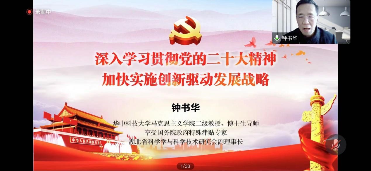 钟书华教授以《深入学习贯彻党的二十大精神加快实施创新驱动发展战略》为主题,阐释了“党的二十大的主题、主要成果”、“马克思主义中国化”、“中国式现代化”、“全面建设社会主义现代化国家的目标”、“加快实施创新驱动发展”五个方面。