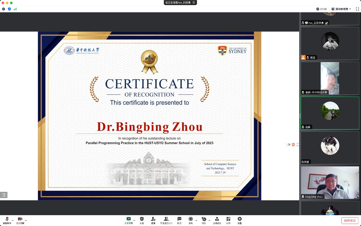 随后,易辉书记向周兵兵老师颁发课程项目授课证书,周兵兵分享了这次华中大-悉尼大学暑期公司的感想,对同学们在项目中的表现十分认可,随后向顺利完成课程学习的同学们颁发结课证书,公布优秀学员名单并线上授予证书,向顺利结业的同学表示祝贺。