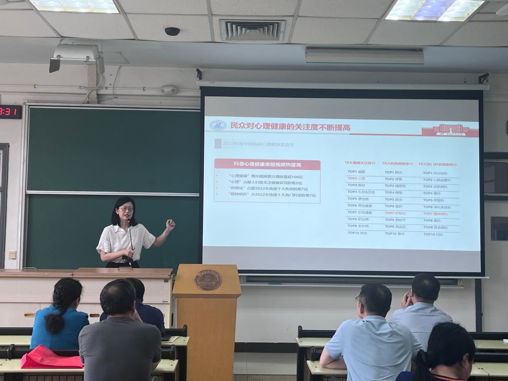 活动伊始,张柯蓝结合相关数据和案例,对当前社会环境和校园环境下,高校师生心理健康方面容易出现的问题和妥善解决心理问题的重要性作出提醒和强调,进一步引起了教师们对员工和自身心理健康维护以及对导学关系处理的重视。