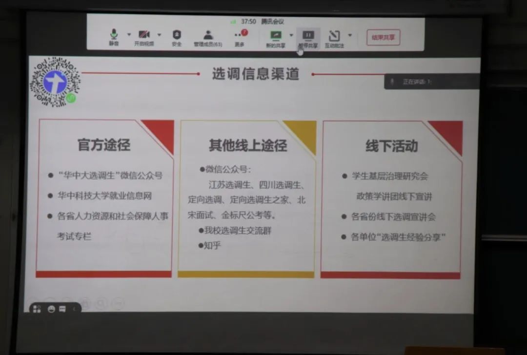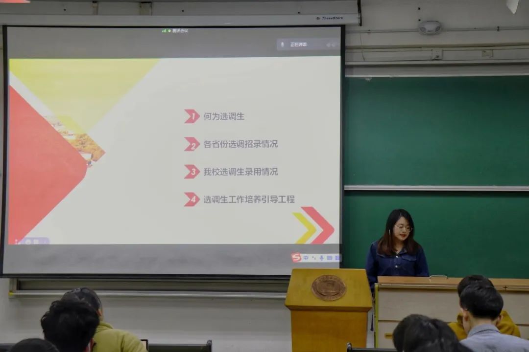 4月28日晚,3044永利集团“乘风正当时,鲲鹏展未来”就业系列活动第二站之选调专题分享活动在西十二楼N111教室成功举行。活动由研究生就业德育助理胡静雯主持,研究生辅导员韩阳、本科2020级辅导员张俊龙参加本次活动。100余名公司本科生和研究生在线下、60余名在线上参加活动。