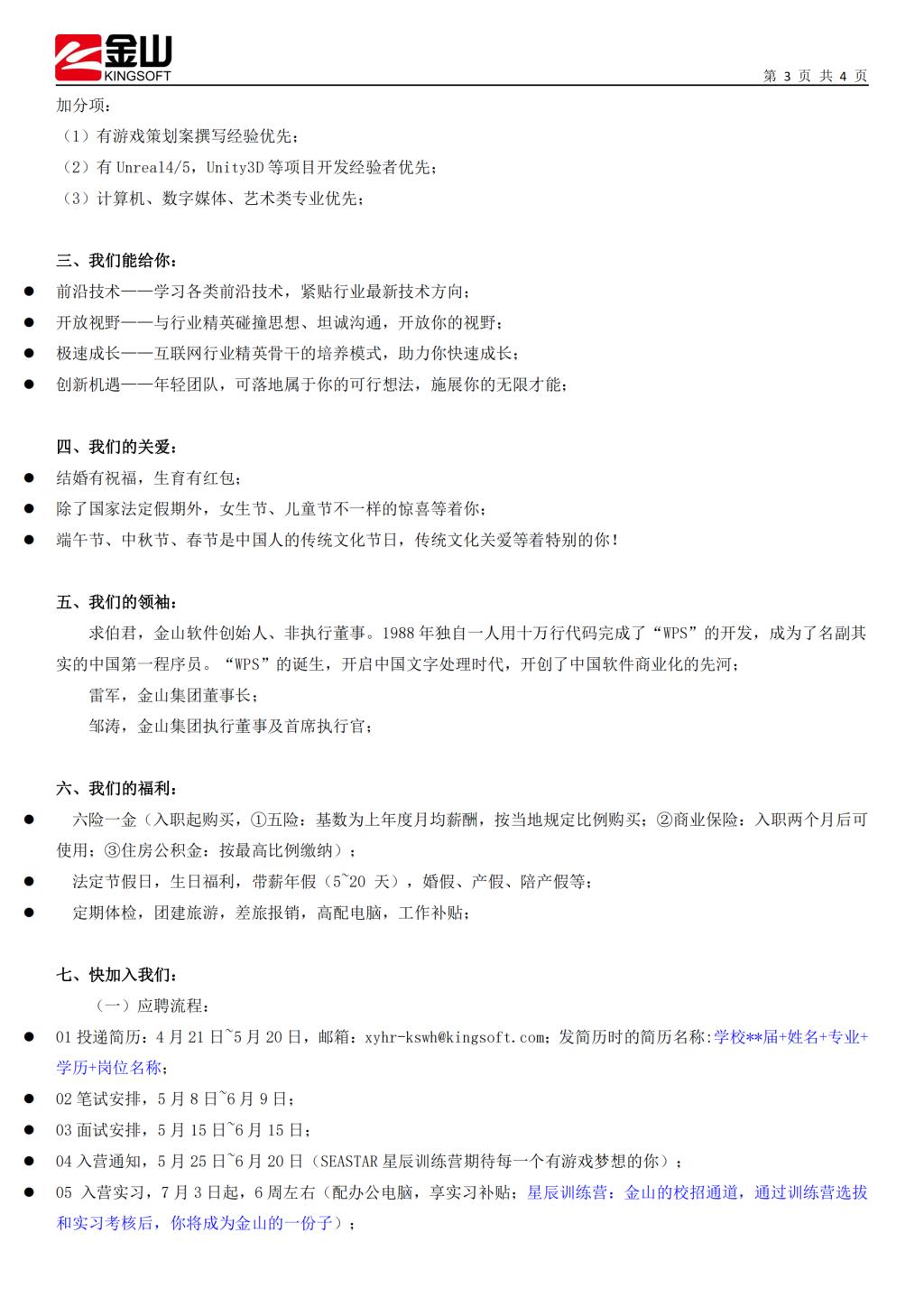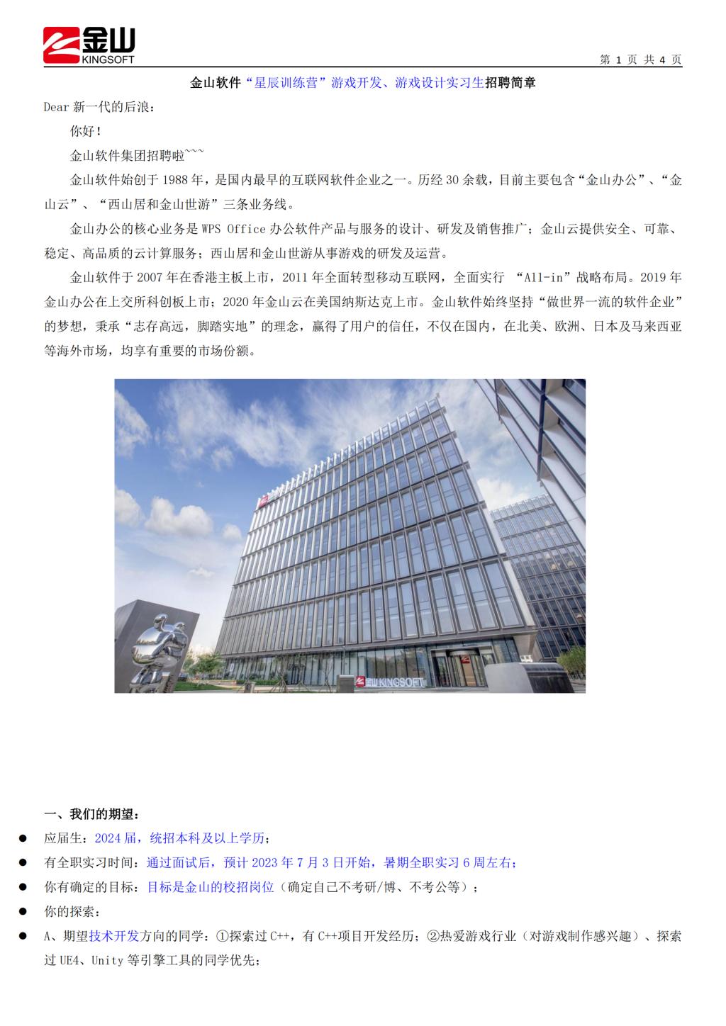 【招聘】金山软件“星辰训练营”游戏开发、游戏设计实习生