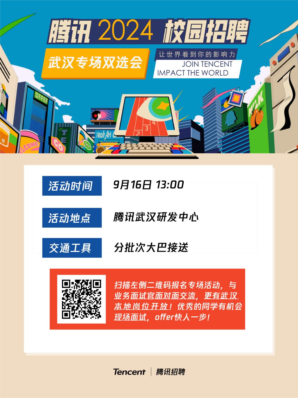 时间:2023年9月16日(周六)13:00-18:00地点:腾讯武汉研发中心(分批次大巴接送)报名:https://wj.qq.com/s2/13081047/3493/ 名额有限,欢迎报名!后续将筛选同学进行详情通知。腾讯2024校园招聘热招中欢迎关注投递:https://join.qq.com/