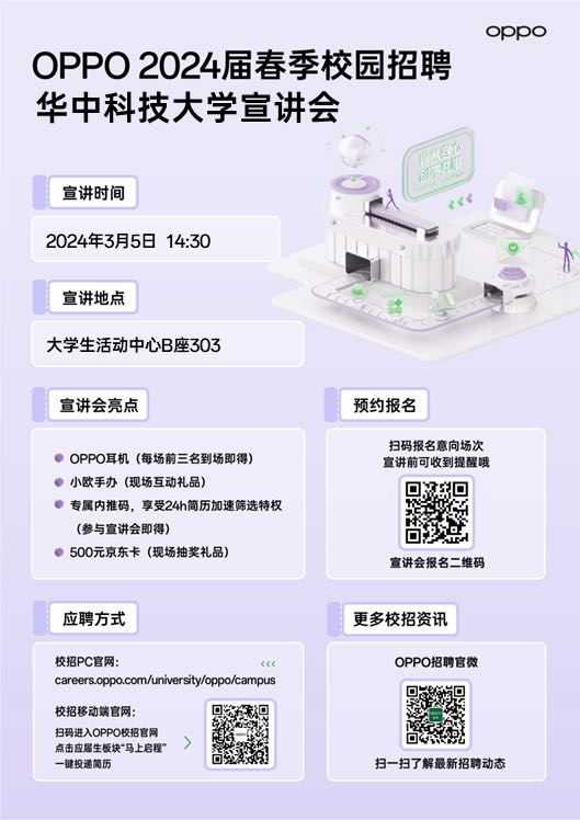 📣OPPO 2024届春招岗位扩招,涉及【AI/算法】【软件】【工程技术】【硬件】【销售服务】等多职类,并于本周二 3月5日进校开展线下宣讲会,现场将有oppo产品、纪念品及500元京东购物卡抽奖活动,并现场收取纸质简历,欢迎同学们到场参与多多投递、多多得奖~
