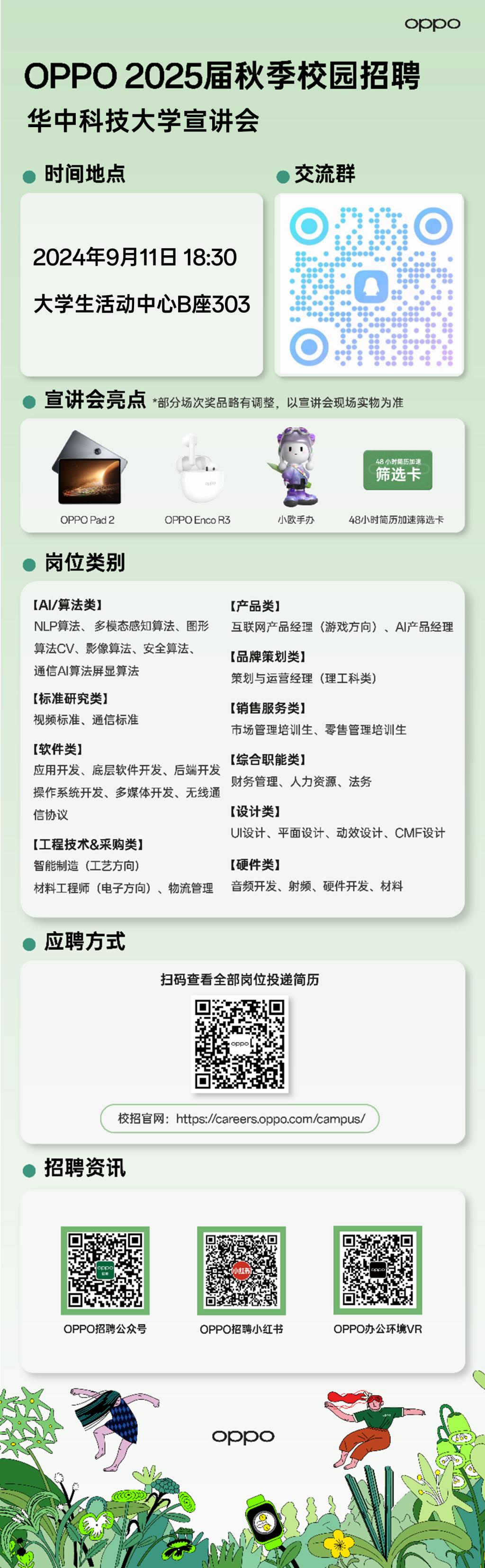 📣 OPPO 2025届秋季校园招聘线下宣讲会推广,涉及【AI/算法】【软件】【工程技术】【硬件】【销售服务】【品牌策划】【产品】【综合职能】等多职类岗位,并于本周三 9月11日进校开展线下宣讲会,现场将有OPPO Pad2、耳机及小欧手办等抽奖活动,到场同学享受48小时简历加速筛选权益,并现场收取纸质简历!