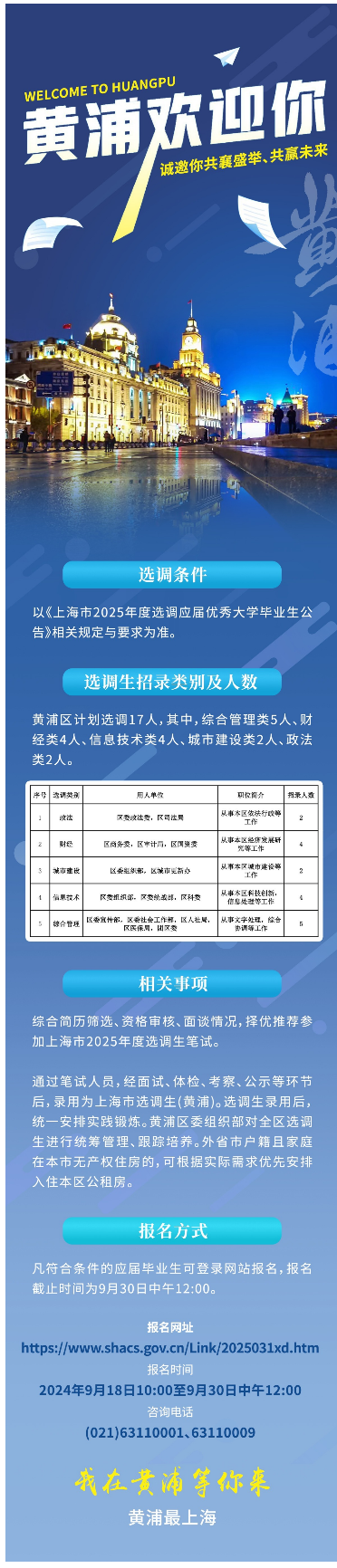 黄浦区位于上海中心城区核心区域,是上海的心脏、窗口和名片。为深入实施人才强区战略,为“建设具有世界影响力的社会主义现代化国际大都市核心引领区”提供人才保障,黄浦区计划选调全日制优秀应届老员工17名。优先选调综合管理、财经、信息技术、城市建设、政法等方面优秀人才。