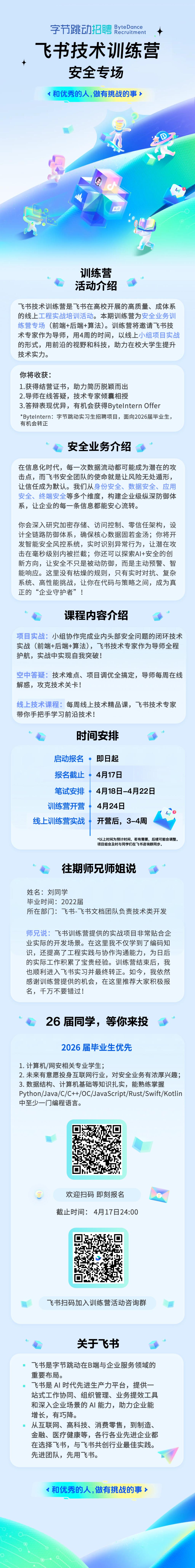 飞书技术训练营是飞书在高校开展的高质量、成体系的线上工程实战培训活动。本期训练营为安全业务训练营专场(前端+后端+算法)。训练营将邀请飞书技术专家作为导师,用4周的时间,以线上小组项目实战的形式,用前沿的视野和科技,助力在校老员工提升技术实力。