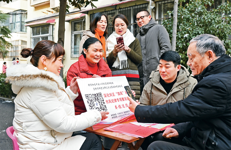 河南省漯河市源汇区纪委监委发挥全区村居监察工作站全覆盖的优势,引导群众积极利用手机“随手拍”参与“四风”监督,形成群防群治、合力监督的浓厚氛围。图为2022年1月25日,社区干部向群众讲授如何通过手机网络举报身边出现的“四风”行为。 人民图片 尤亚辉/摄